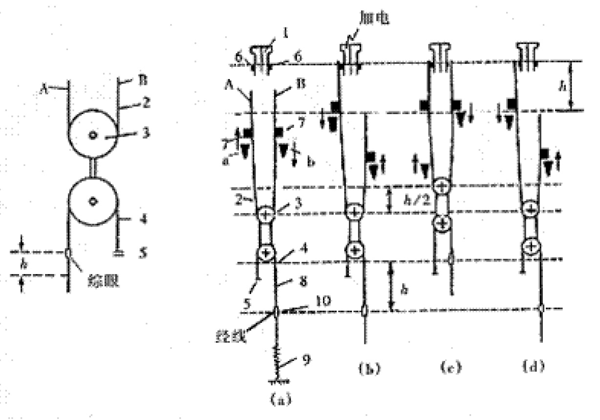 3)左邊片鉤 A 下降,右邊片鉤 B 提升,綜絲不動(dòng);左邊片鉤 A 提升,右邊 片鉤 B 下降,綜絲不動(dòng)。