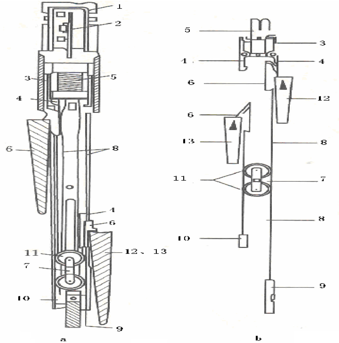 1.外殼 2.電子板 3.彈簧 4.固定鉤 5.電磁閥 6.運(yùn)動(dòng)鉤 7.連接件 8.繩索 9.首線(xiàn) 10.固定點(diǎn) 11.滑輪 12、13.提刀