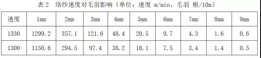 品種:陽離子滌綸T/R 65/35 18.4tex,試驗條件:YG172A紗線毛羽測試儀,測試速度:30m/min,測試長度:60m,絡筒速度:1300m/min2.2.6.1 做好優(yōu)化工藝控制自絡毛羽增長的試驗(1)優(yōu)選絡筒速度和絡紗張力,自動絡筒機絡紗張力、絡紗速度對毛羽有很大的影響。絡紗速度和絡紗張力在工藝調整時應看做一個整體進行,如果僅考慮一個工藝參數(shù)會適得其反,具體優(yōu)選時相互結合,可以做到高速運行毛羽增長幅度不大的效果。絡紗速度對毛羽影響見表2。