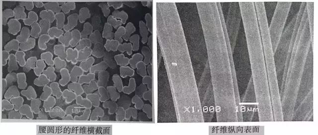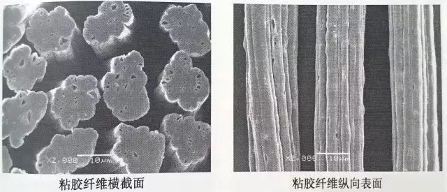 普通粘膠纖維復(fù)雜成型過(guò)程的不均勻性會(huì)使常規(guī)粘膠纖維的橫截面呈腰圓形或無(wú)規(guī)則狀,內(nèi)部有孔洞,縱向有無(wú)規(guī)則溝槽。粘膠具有優(yōu)良的吸濕性、易染性,但是其模量、強(qiáng)度較低,尤其是濕強(qiáng)度低。