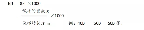 旦尼爾(Denter)制:(一般表示長(zhǎng)絲)在公定回潮率時(shí),以9000m長(zhǎng)度的重量克數(shù)來(lái)表示算稱旦數(shù),用ND表示: