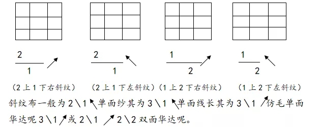 2) 斜紋組織:一個(gè)組織循環(huán)至少要有三根經(jīng)紗和三根緯紗,在組織圖上有經(jīng)組織點(diǎn)或緯組織點(diǎn)構(gòu)成的斜線。斜紋組織的織物表面上有經(jīng)(緯)浮長(zhǎng)線構(gòu)成的斜向織紋。