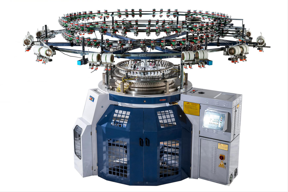 Hanma漢馬毛圈針織機是用以編織毛圈組織針織物的針織機。在用地紗編織地組織的同時,喂入毛圈紗。毛圈紗與地紗一起參加編織。針織機的沉降片或鉤針將毛圈紗的線圈沉降弧拉長,形成毛圈。毛圈織物適于作服裝、家庭用品和某些工業(yè)材料。毛圈針織機的種類較多,有緯編機型,也有經(jīng)編機型。比較普遍應用的是單針床多三角機機型。它通過的導紗器,將地紗和毛圈紗分別墊放在沉降片的片顎和片鼻上,并同時處于舌針的針口內(nèi),如上頁圖所示。編織后,片顎上地紗形成緯編平針組織的地組織,片鼻上毛圈紗在與地紗一起成圈的同時,在織物反面形成拉長的沉降弧。選用片顎與片鼻不同高度差的沉降片,可編織出不同毛圈長度的針織物。在這種毛圈針織機上,還可安裝提花裝置,控制沉降片進出,使毛圈紗有時在沉降片片顎上成圈,有時在片鼻上成圈,可編織花色毛圈針織物。毛圈針織機也有雙針床圓緯機機型,一只針床上的舌針同時鉤住地紗和毛圈紗編織成圈,另一針床上的無舌鉤針僅鉤住毛圈紗,拉長毛圈紗線圈的沉降弧,形成毛圈針織物,如上頁圖b所示。用改變無舌鉤針與舌針的相對位置,便可編織不同長度的毛圈。