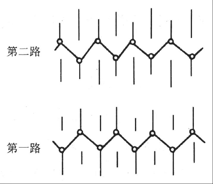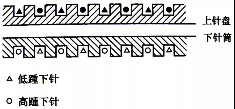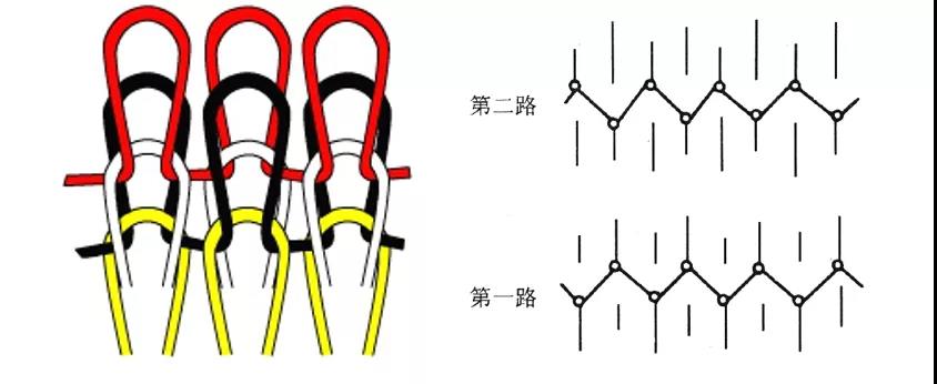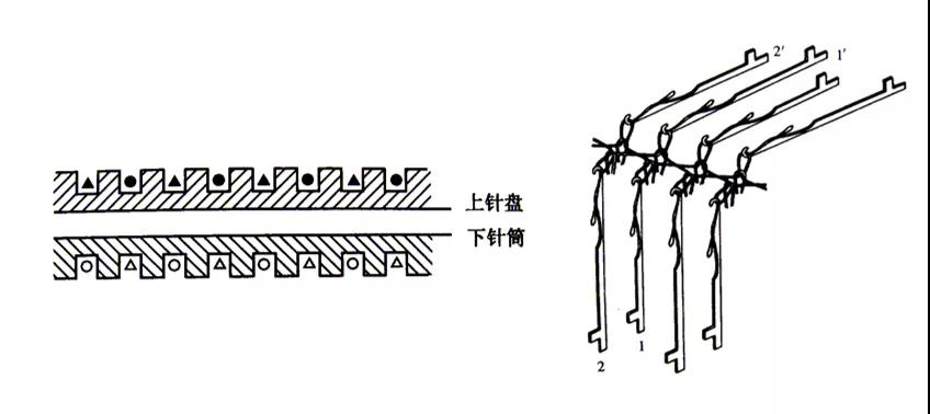 雙羅紋組織由兩根紗線形成一個線圈橫列,一根紗線編織時,下針筒的奇數(shù)針和上針盤的偶數(shù)針相配合形成一個1+1羅紋;另一根紗線編織時,下針筒的偶數(shù)針與上針盤的奇數(shù)針相配合形成另一個1+1羅紋?;ユi形成雙羅紋組織。