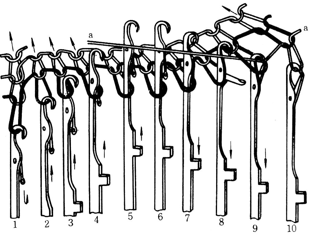 套圈:織針下降,舊線圈套在針頭上(圖中9位置)。