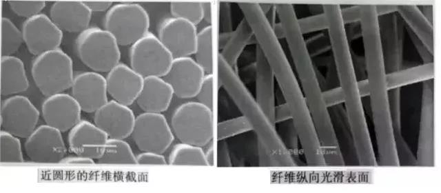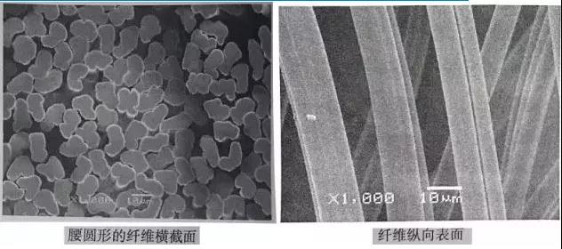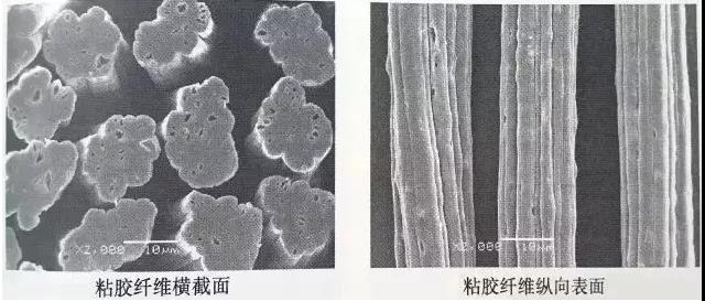 普通粘膠纖維復(fù)雜成型過程的不均勻性會使常規(guī)粘膠纖維的橫截面呈腰圓形或無規(guī)則狀,內(nèi)部有孔洞,縱向有無規(guī)則溝槽。粘膠具有優(yōu)良的吸濕性、易染性,但是其模量、強(qiáng)度較低,尤其是濕強(qiáng)度低。