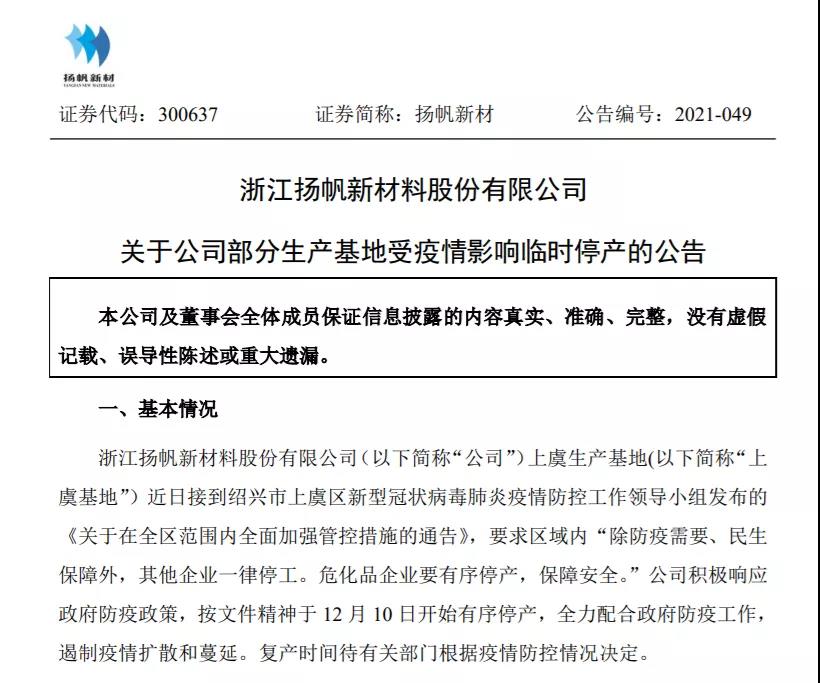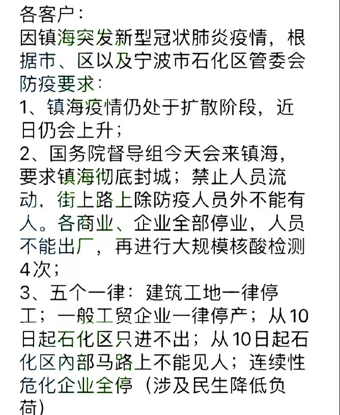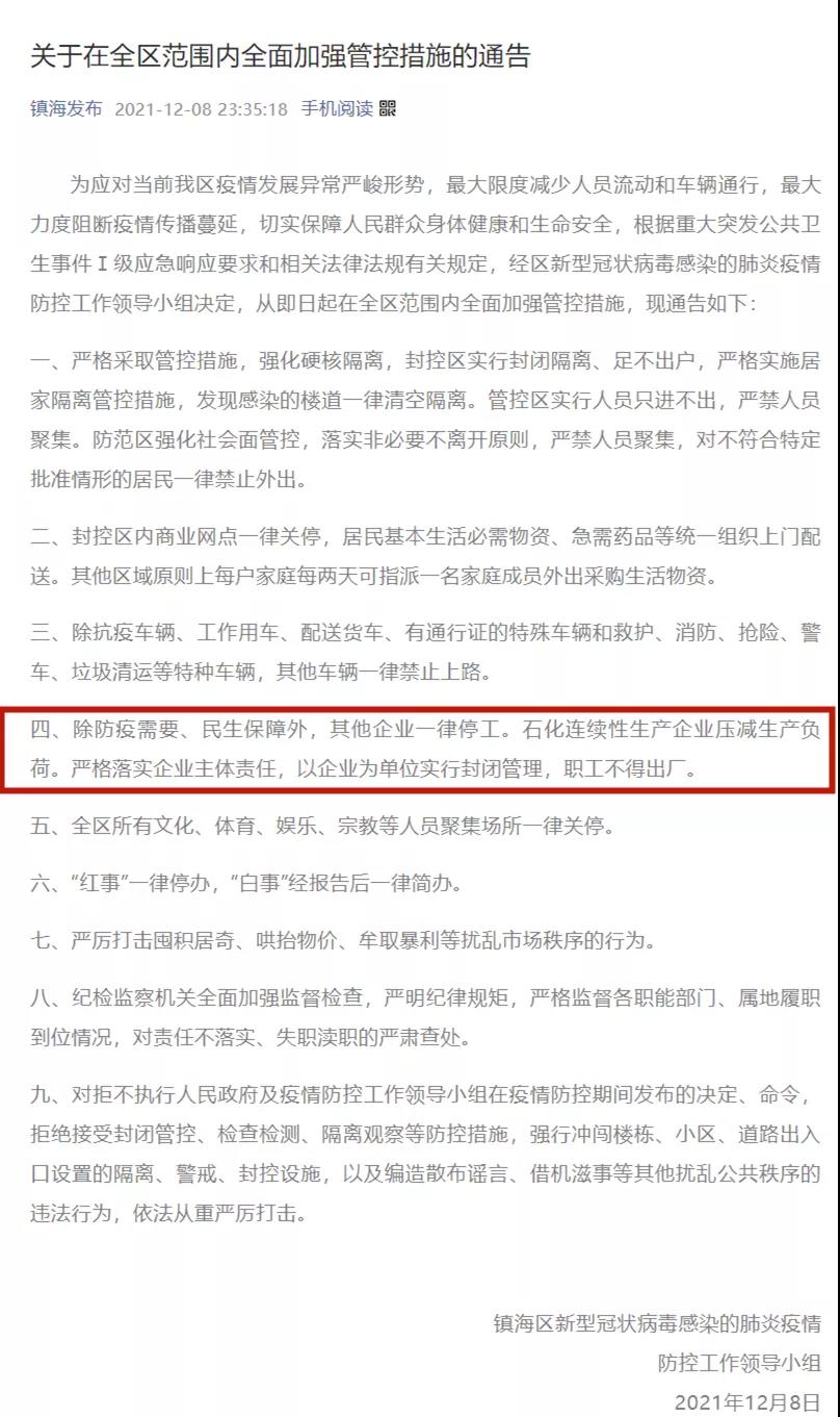 紹興上虞啟動I級應(yīng)急響應(yīng),多個區(qū)域臨時實施封閉管理。除防疫需要和民生保障以外,區(qū)域內(nèi)其他各類企業(yè)暫時停工。另據(jù)部分企業(yè)表示,全區(qū)所有工業(yè)企業(yè)一律實施停產(chǎn)防疫,非化企業(yè)12月9日14時起立即嚴(yán)格執(zhí)行停產(chǎn)防疫措施,化工企業(yè)12月9日14時起嚴(yán)格執(zhí)行停止投料,啟動執(zhí)行安全停產(chǎn)方案,有檢維修等作業(yè)的一并執(zhí)行停止作業(yè)。