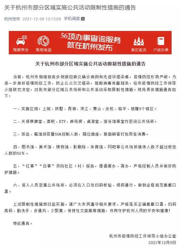 經(jīng)市疫情防控工作領(lǐng)導(dǎo)小組研究決定,對杭州市部分區(qū)域公共場所和公共活動采取限制性措施。上城、拱墅、西湖、濱江、蕭山、余杭、臨平、錢塘8個城區(qū),關(guān)停棋牌室、酒吧、KTV、麻將房、桌游室、游泳館等室內(nèi)密閉公共場所等。