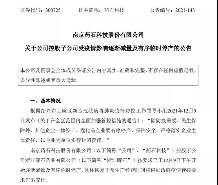 藥石科技:公司控股子公司浙江暉石藥業(yè)有限公司按要求已于12月9日下午開始逐漸減量及有序臨時停產(chǎn),具體恢復(fù)正常生產(chǎn)經(jīng)營時間將根據(jù)政府疫情管控要求作出安排。預(yù)計本次逐漸減量及有序臨時停產(chǎn)將延遲浙江暉石產(chǎn)品的生產(chǎn)和交付,將對浙江暉石經(jīng)營業(yè)績產(chǎn)生一定的不利影響。