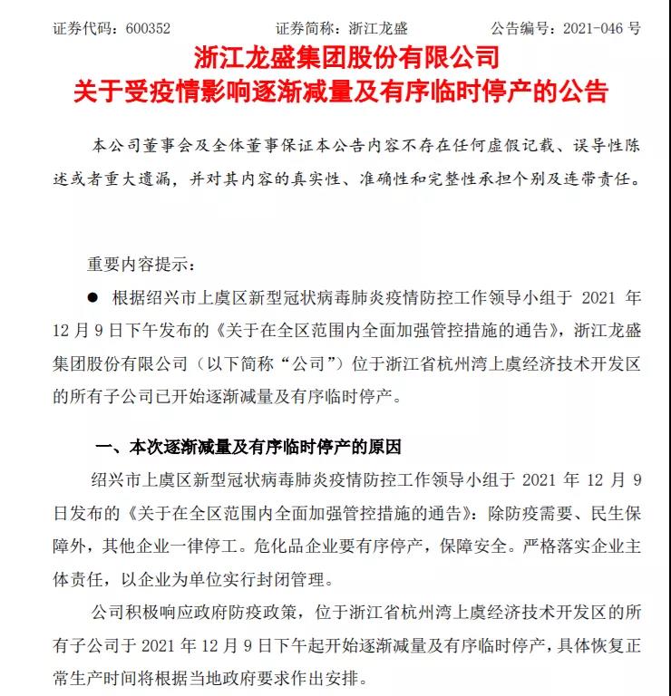浙江龍盛:受疫情影響,公司位于浙江省杭州灣上虞經(jīng)濟技術(shù)開發(fā)區(qū)的所有子公司已開始逐漸減量及有序臨時停產(chǎn)。上述子公司主要目前主要生產(chǎn)染料、化工中間體、減水劑等化工產(chǎn)品,預(yù)計此次臨時停產(chǎn)將延遲公司相關(guān)產(chǎn)品的生產(chǎn)和交付,會對公司本月經(jīng)營業(yè)績產(chǎn)生不利影響。
