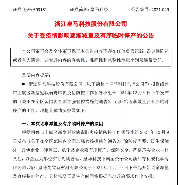 皇馬科技:公司下屬全資子公司浙江綠科安化學(xué)有限公司、浙江皇馬尚宜新材料有限公司于12月9日下午起開始逐漸減量及有序臨時停產(chǎn)。預(yù)計本次逐漸減量及有序臨時停產(chǎn)將延遲公司產(chǎn)品的生產(chǎn)和交付,預(yù)計會對公司本月經(jīng)營業(yè)績產(chǎn)生不利影響。