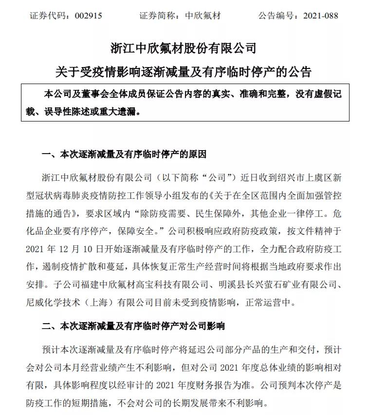 中欣氟材:于2021年12月10日開始逐漸減量及有序臨時停產(chǎn),具體恢復(fù)正常生產(chǎn)經(jīng)營時間將根據(jù)當(dāng)?shù)卣笞鞒霭才拧?/span>