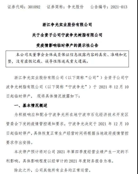 爭光股份:全資子公司寧波爭光樹脂有限公司于2021年12月10日起臨時停產(chǎn),具體恢復(fù)正常生產(chǎn)經(jīng)營時間將根據(jù)當(dāng)?shù)卣咔楣芸匾笞鞒霭才拧?/span>
