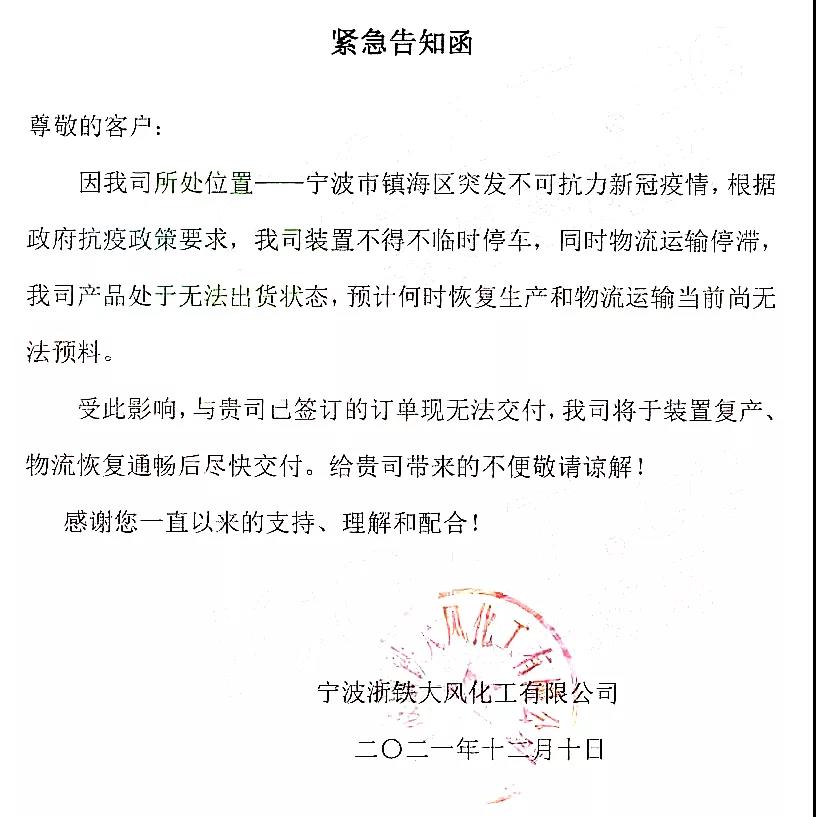 寧波浙鐵大風(fēng)化工:根據(jù)要求,裝置不得不臨時停車,物流運輸停滯,產(chǎn)品處于無法出貨狀態(tài),已簽訂的訂單現(xiàn)無法交付。