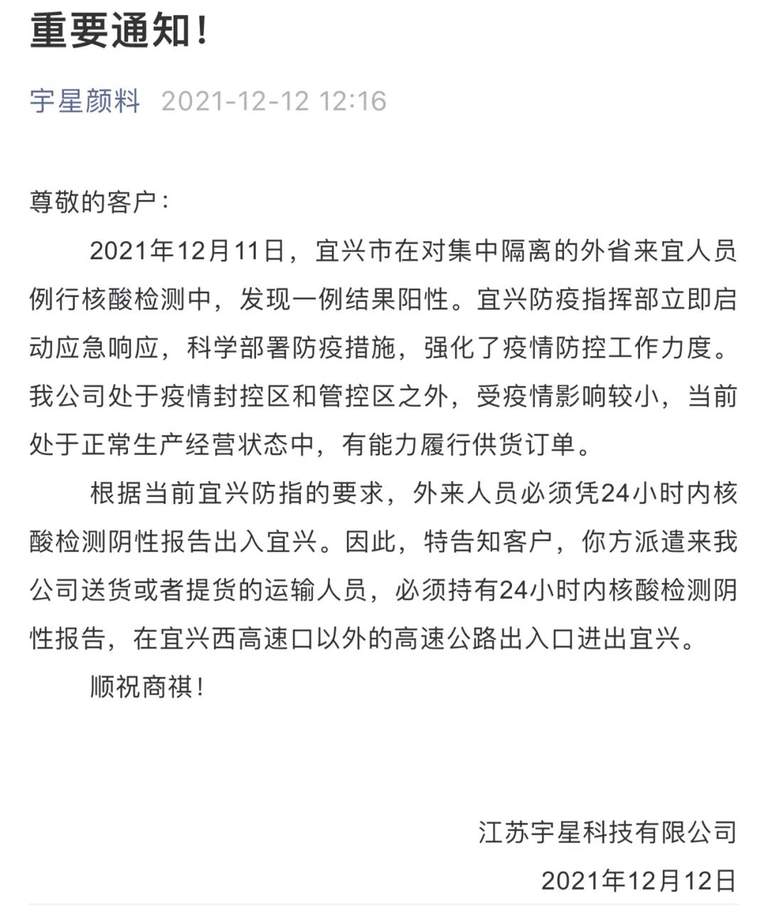 除此之外,江蘇宇星顏料、江蘇三木集團(tuán)、華祥(中國)高纖有限公司、榮盛集團(tuán)等當(dāng)?shù)仄髽I(yè)均提示客戶,由于當(dāng)?shù)匾咔榉忾],來提貨或送貨的運輸人員,須持有24/48小時內(nèi)核酸檢測陰性報告,并注意選擇特定高速口進(jìn)出,健康碼為紅碼、黃碼的司機及外來人員一律不準(zhǔn)進(jìn)入。