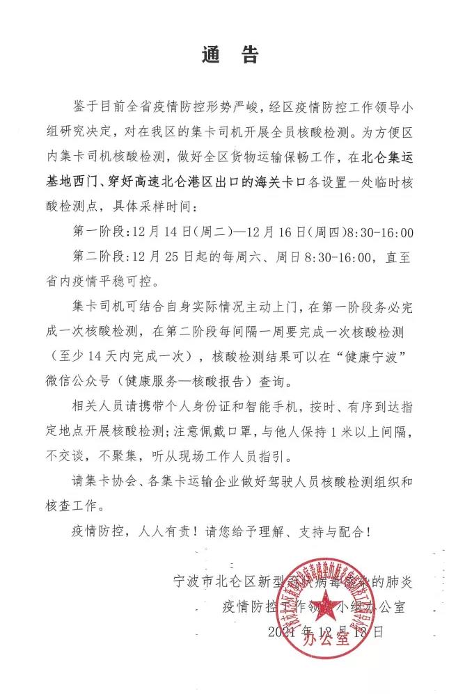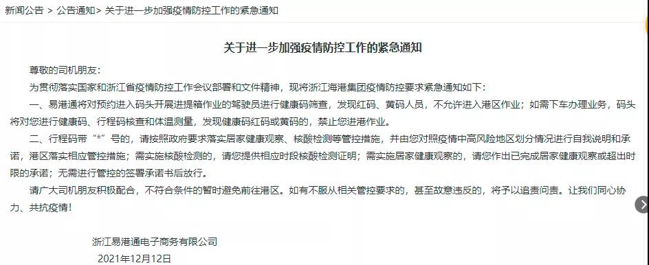 12月12日,受疫情升級影響,寧波舟山港發(fā)布了關(guān)于進(jìn)一步加強疫情防控工作的緊急通知,將對預(yù)約進(jìn)入碼頭開展進(jìn)提箱作業(yè)的駕駛員進(jìn)行健康碼篩查。