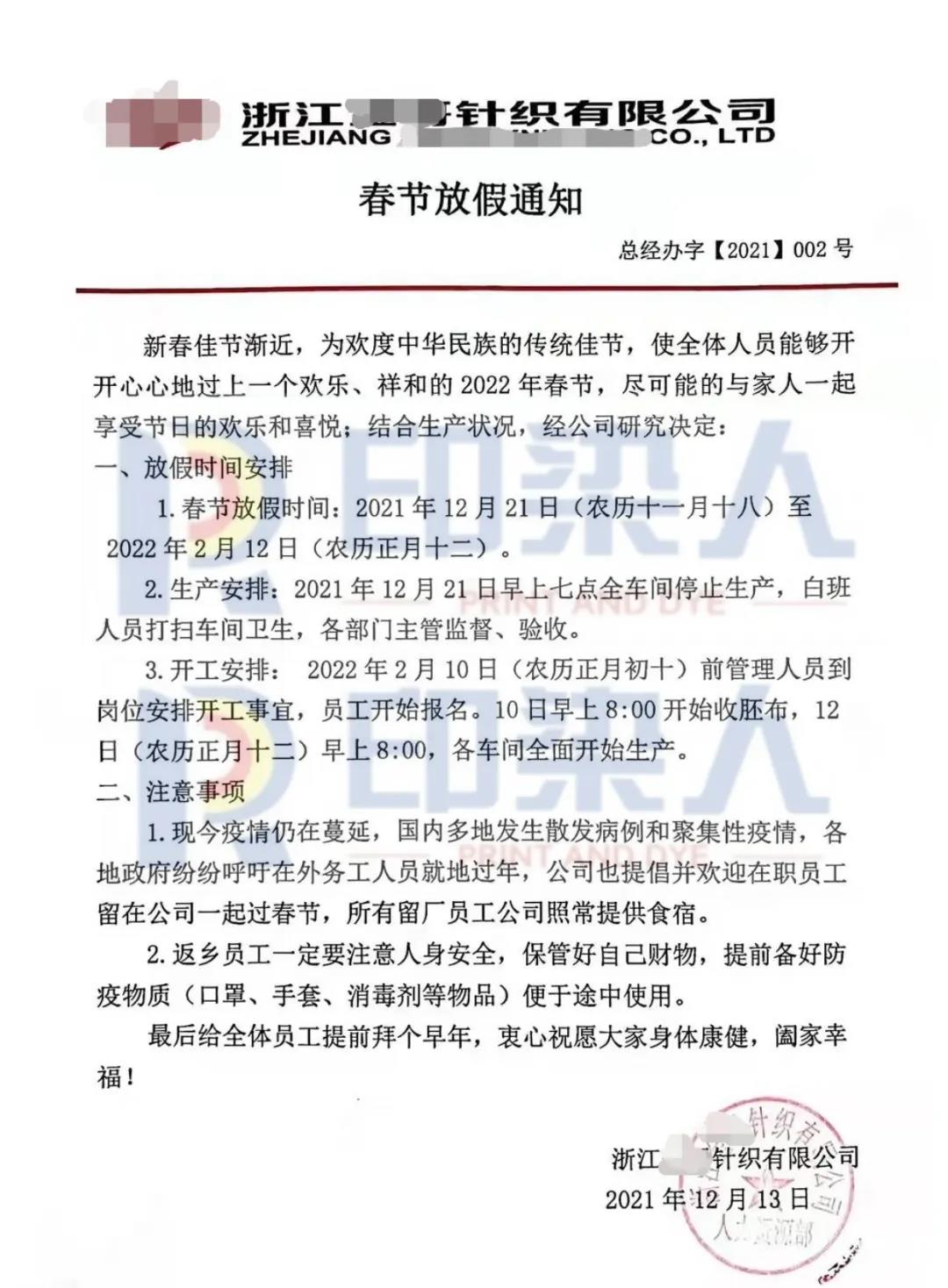 浙江金華某大型針織染廠春節(jié)放假時間為:2021年12月21日-2022年2月12日。