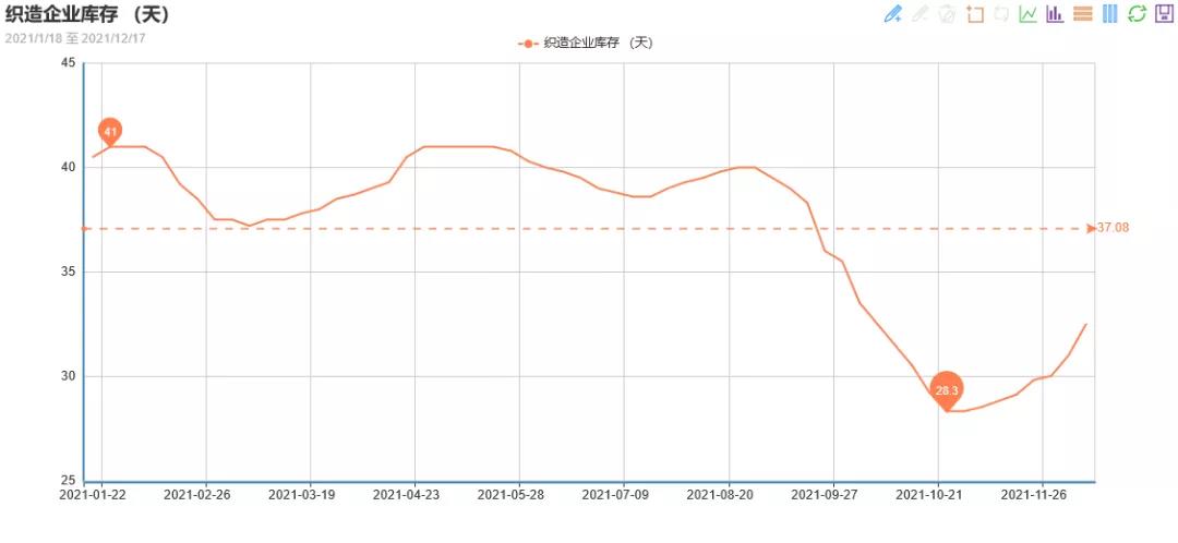 另一方面,近期由于浙江疫情及年底需求較差,市場傳言今年紡織廠的放假時間可能會出現(xiàn)提前的情況。目前織造廠家的庫存正處于上升階段,據(jù)綢都網(wǎng)數(shù)據(jù)監(jiān)測顯示,目前織造廠家的庫存在32.5天左右,較11月上升4天。另外江浙多地紡織廠及貿易商反饋,近一周多來常規(guī)坯布詢價和出貨仍沒有多大起色,成交價明顯回落,部分廠家調整幅度超過20%。同時原料價格也以小幅陰跌為主。