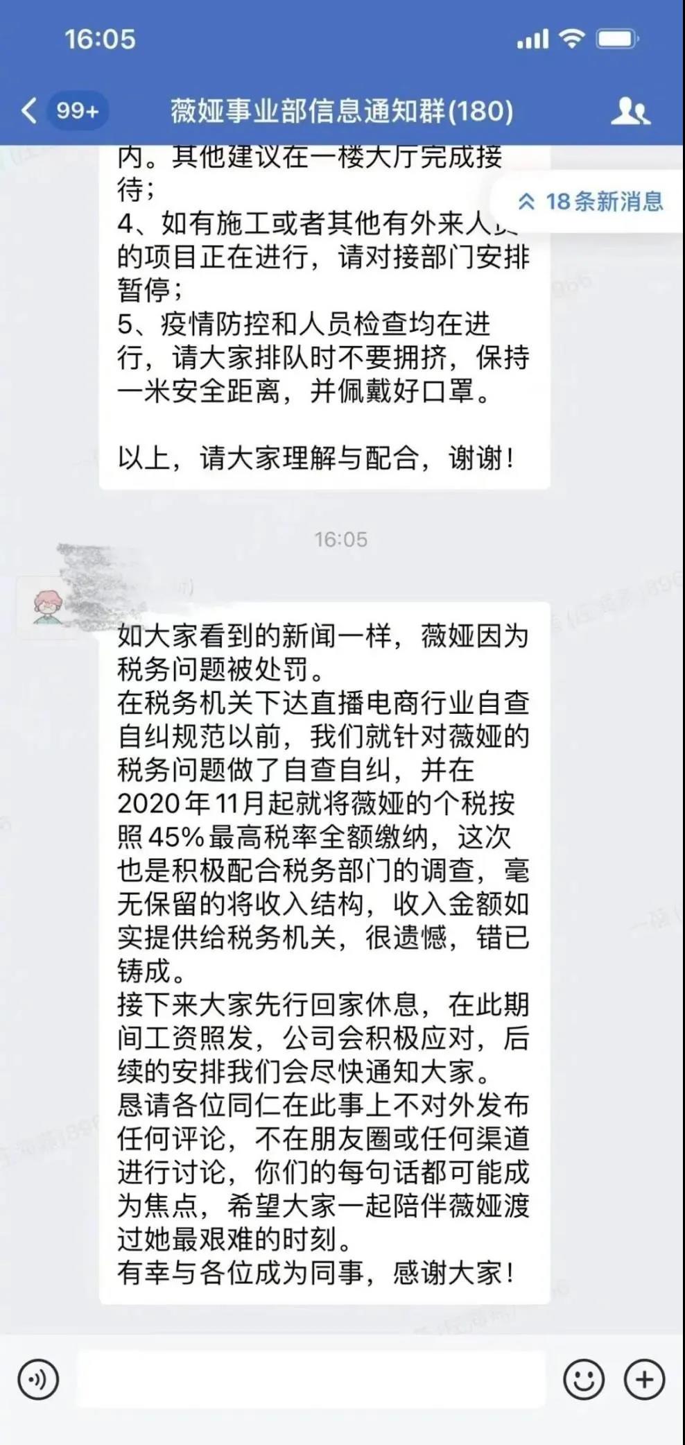 值得注意的是,20日下午,薇婭事業(yè)部信息通知群截圖流出,薇婭經(jīng)紀人王斯(古默)發(fā)言表示,“接下來請大家先行回家休息,在此期間工資照發(fā)”。一位接近薇婭事業(yè)部的行業(yè)人士告訴記者,此圖片消息屬實,后續(xù)公司將就此發(fā)布公告。