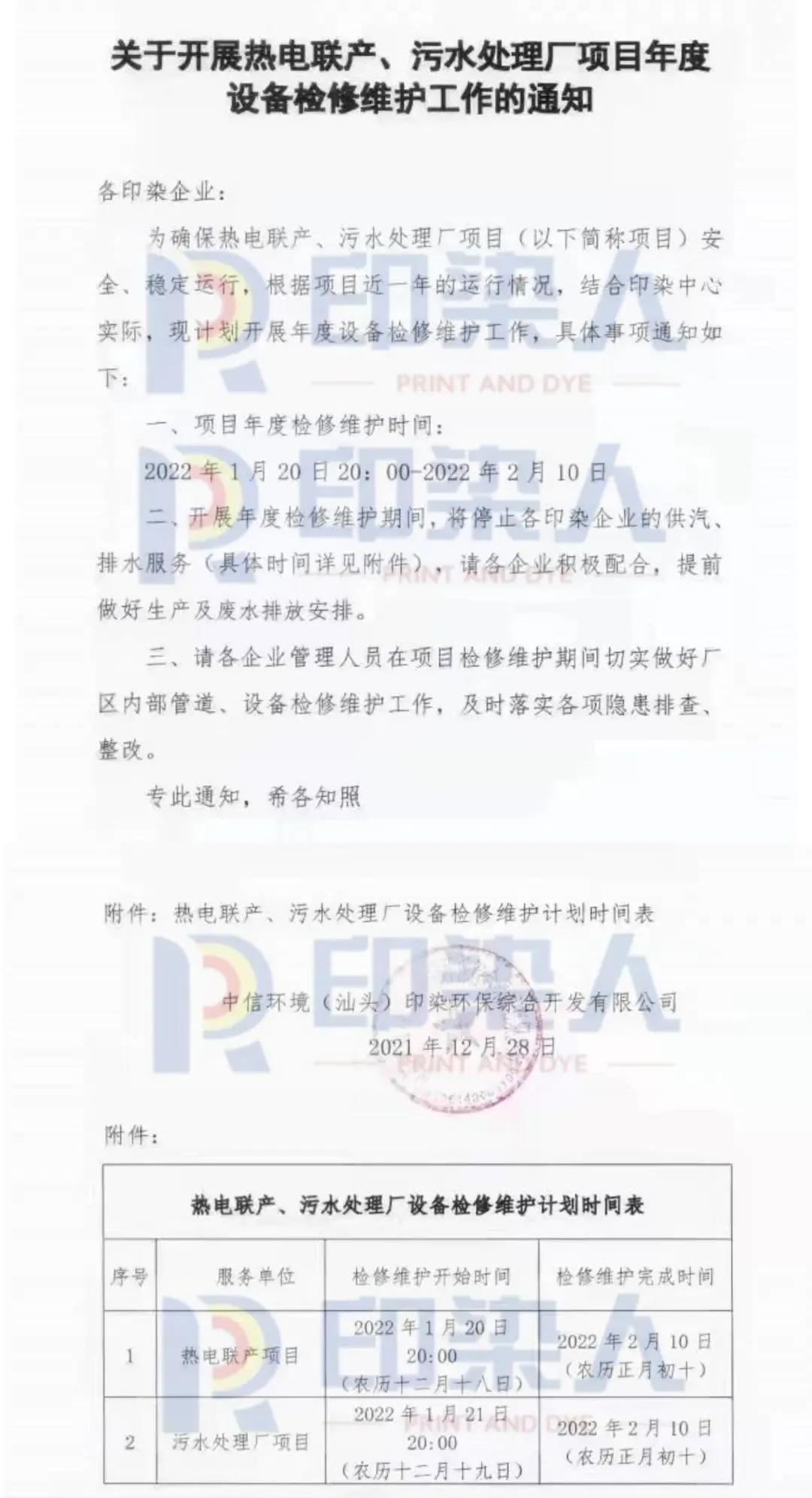 近日,中信環(huán)境(汕頭)印染環(huán)保發(fā)布《關(guān)于開展熱電聯(lián)產(chǎn)、污水處理廠項(xiàng)目年度設(shè)備檢修維護(hù)工作的通知》,告知園區(qū)各印染企業(yè),將于2022年 1月 20日 20:00開始項(xiàng)目年度檢修維護(hù)工作。