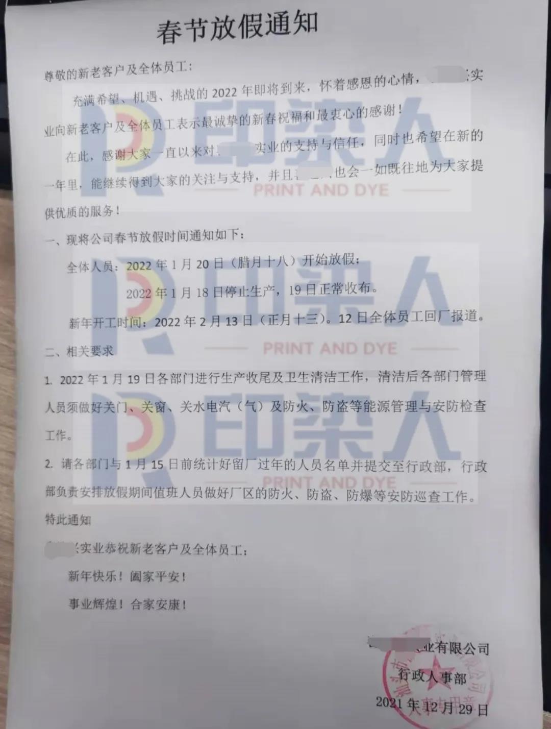 與此同時(shí),潮南印染產(chǎn)業(yè)園有印染企業(yè)發(fā)出《春節(jié)放假通知》,具體時(shí)間為:2022年 1月 20日開始放假,2022年 2月12日全體員工回廠報(bào)道。并對(duì)放假期間的工作進(jìn)行了安排。