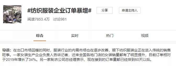受內(nèi)需市場驅(qū)動,疊加海外訂單回流,我國紡織業(yè)經(jīng)營情況好轉(zhuǎn),營收穩(wěn)步增長。國家統(tǒng)計局的數(shù)據(jù)顯示,2021年1-6月,我國服裝行業(yè)規(guī)模以上企業(yè)12467家,累計實現(xiàn)營業(yè)收入6534億元,同比增長12.99%;利潤總額274億元,同比增長13.87%;服裝產(chǎn)量113.23億件,同比增長19.98%。也有別的紡織人表達(dá)出了自己。