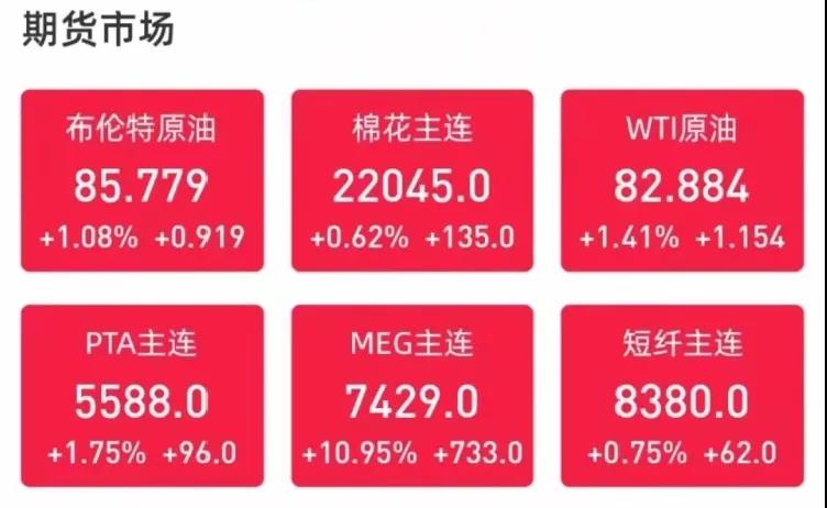 原料昨日又是火紅一片,受油價及減產(chǎn)影響,聚酯原料PTA大漲,乙二醇期貨主力合約漲停,漲幅10.99%,報7432元/噸,熔體成本突破7200,較9月份上漲1200元再次創(chuàng)下年內(nèi)新高。