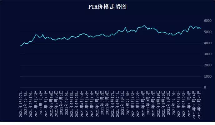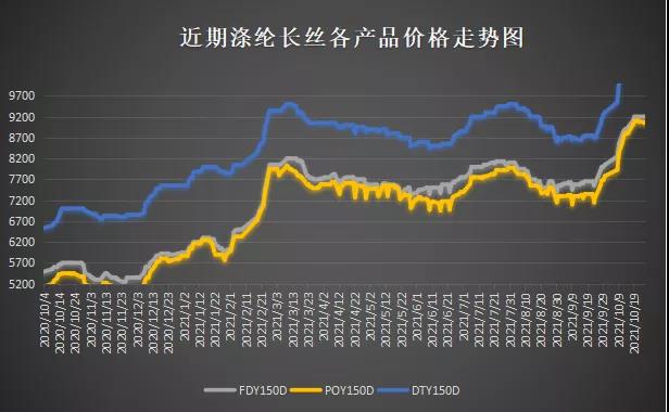 受動(dòng)力煤影響,上游化纖原料PTA、乙二醇、滌綸長(zhǎng)絲等聚酯產(chǎn)品價(jià)格開(kāi)始出現(xiàn)回調(diào)現(xiàn)象。PTA在上周沖高后連續(xù)下跌,期貨價(jià)格較10月15日下降80元/噸。2021年四季度以來(lái),滌綸長(zhǎng)絲價(jià)格震蕩上揚(yáng),遠(yuǎn)超2019-2020年同期價(jià)格,在10月中旬達(dá)到近期最高值。但隨后開(kāi)始出現(xiàn)下跌,目前震蕩運(yùn)行,似乎漲勢(shì)結(jié)束。從下圖的曲線(xiàn)圖中我們也可以看到下跌趨勢(shì),原料價(jià)格踩下上漲剎車(chē),或恢復(fù)低價(jià)。