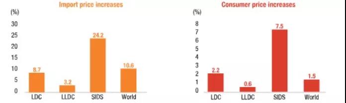 小島嶼發(fā)展中國家(SIDS)受到的影響最大,海運成本飆升將令其消費者價格上漲7.5個百分點。內陸發(fā)展中國家(LLDC)消費者價格可能上漲0.6%。