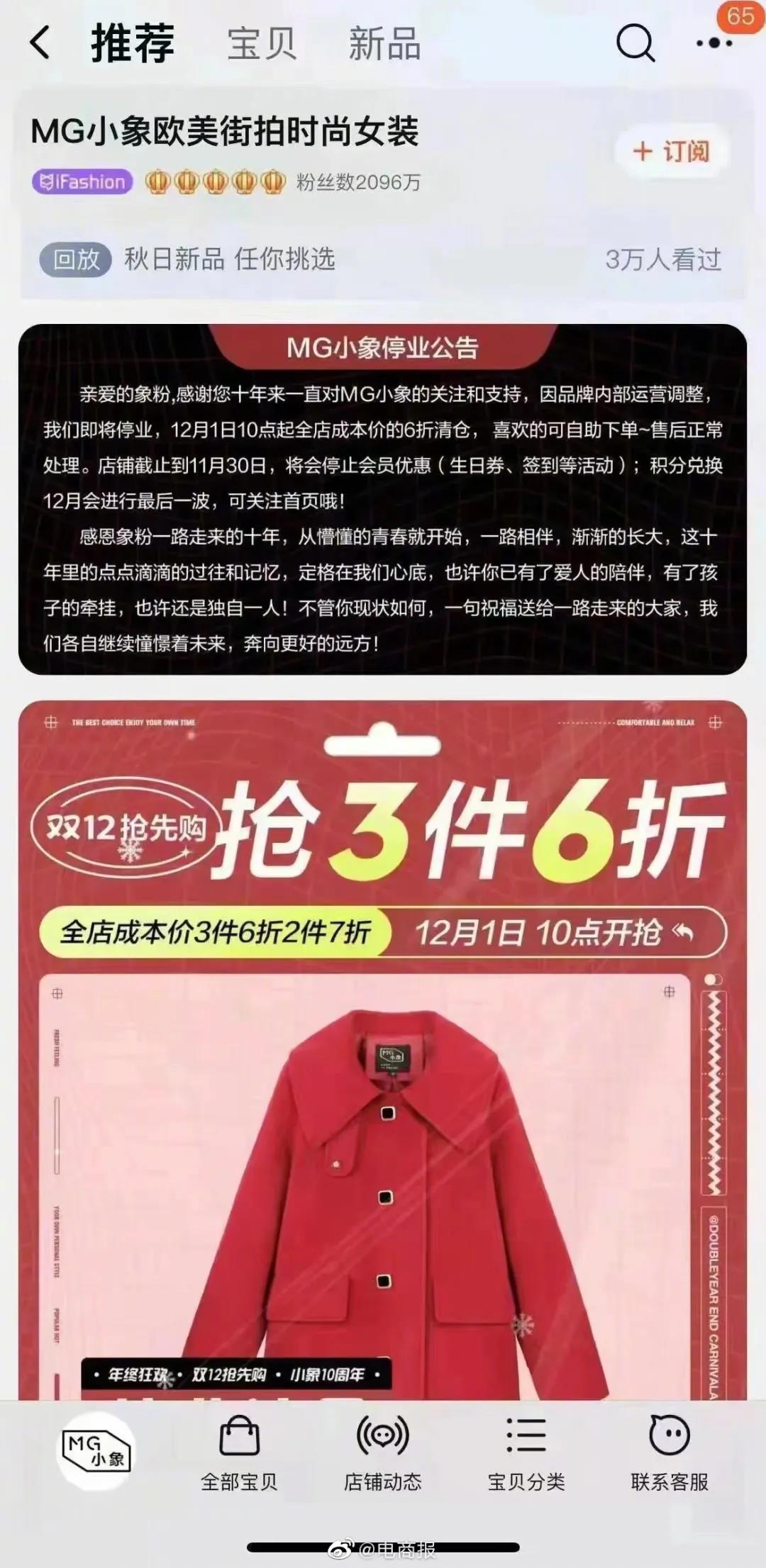 #淘寶#2000萬粉絲的女裝皇冠店:#毛菇小象#竟然停業(yè)了!據了解知名女裝店:毛菇小象(MG小象)要停業(yè)了。