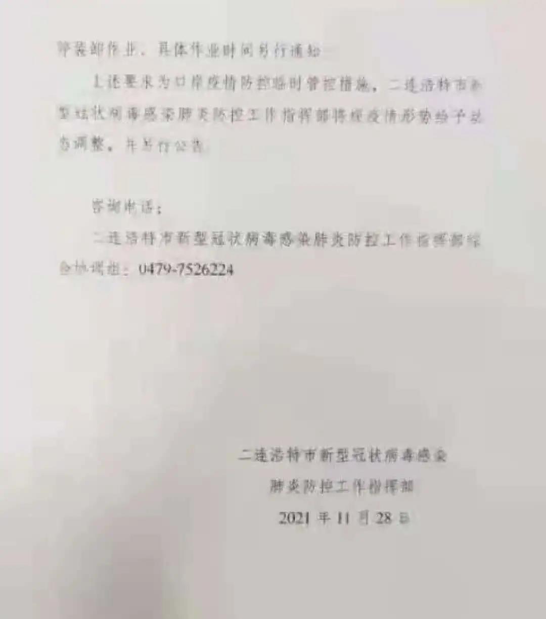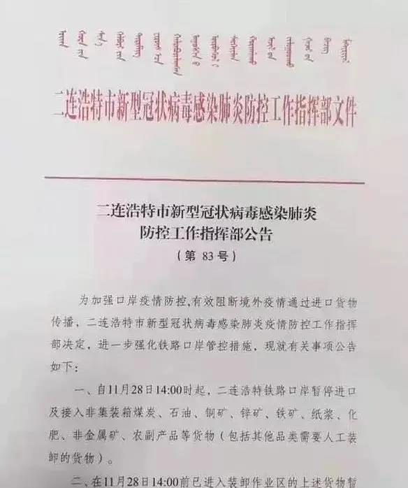 一、自11月28日14:00時(shí)起,二連浩特鐵路口岸暫停進(jìn)口及接入非集裝箱煤炭、石油等貨物(包括其他品類需要人工裝卸貨物)。