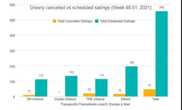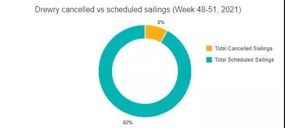 在跨太平洋、跨大西洋、亞洲-北歐和亞洲-地中海等主要航線總共556個(gè)預(yù)定航次中,在第48周至第51周之間取消了47個(gè)航次,取消率為8%。根據(jù)德魯里本期數(shù)據(jù),在此期間,72%的空白航行將發(fā)生在跨太平洋東向貿(mào)易航線中。