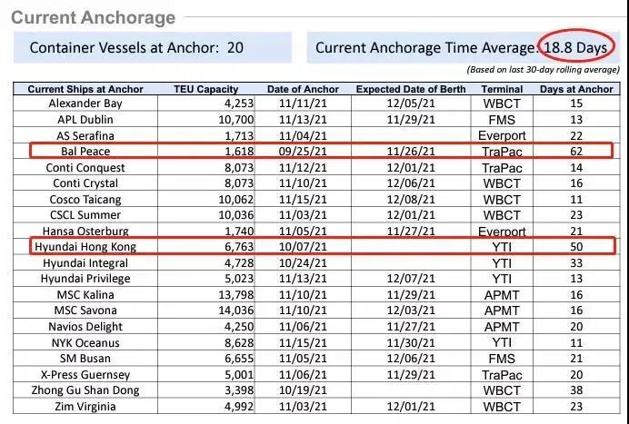 據(jù)洛杉磯港signal平臺(tái)11月26日的最新數(shù)據(jù)顯示,目前在洛杉磯港和長(zhǎng)灘港外每艘船的平均等待靠泊的時(shí)間已達(dá)到18.8天,是兩個(gè)月前的兩倍多,這艘"Bal Peace"的集裝箱船等待靠泊已達(dá)62天,雖然新的船舶排隊(duì)系統(tǒng)算法表面上看等待的船只減少了,但是船舶實(shí)際等待的時(shí)間加長(zhǎng)了,這無(wú)疑令這兩大港口外集裝箱船的擁堵情況愈發(fā)惡化。