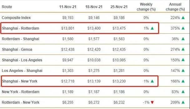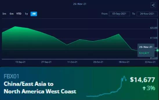 根據(jù)全球-波羅的海貨柜26日最新運(yùn)價(jià)指數(shù)(FBX)顯示,亞洲至美西運(yùn)價(jià)指數(shù)已經(jīng)從11月19日每40英尺集裝箱14185美元上漲至26日的14677美元;亞洲至美東運(yùn)價(jià)指數(shù)已經(jīng)從11月19日每40英尺集裝箱16124美元上漲至26日的16633美元。二者航線的運(yùn)價(jià)漲幅均達(dá)3%。
