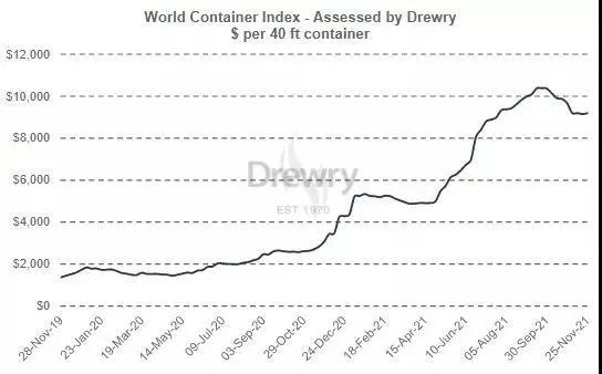 而德魯里上周最新綜合世界集裝箱指數(shù)保持穩(wěn)定,維持在每40英尺集裝箱9186.39美元,但仍比去年同期高出224%。由其評(píng)估的年初至今的WCI平均綜合指數(shù)為每40英尺集裝箱7413美元,比每40英尺集裝箱2690美元的五年平均值高出4723美元。