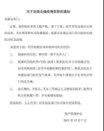 近期,疫情防控形勢又趨嚴峻。鑒于寧波、紹興等周邊地區(qū)出現(xiàn)的疫情,為有效阻斷病毒傳播蔓延,現(xiàn)要求各儲運部門共同做好疫情防控應(yīng)急措施。