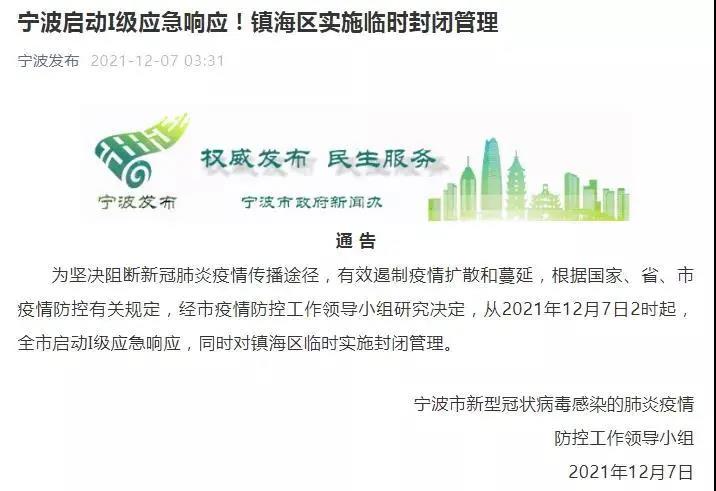 12月7日凌晨,“寧波發(fā)布”官方發(fā)布通知稱,從2021年12月7日2時起,寧波全市啟動I級應(yīng)急響應(yīng),同時對鎮(zhèn)海區(qū)臨時實施封閉管理。