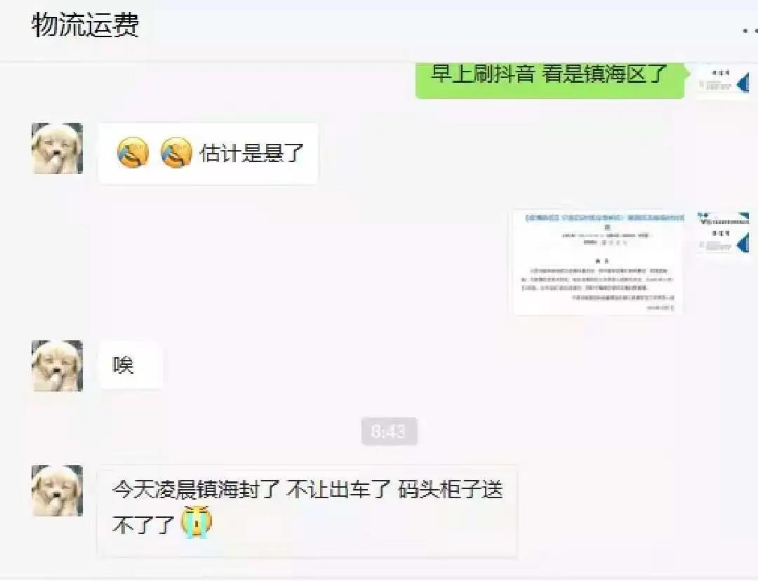 有物流公司表示,“鎮(zhèn)海封掉之后不讓出車,碼頭柜子也送不了了,本來在截單的訂單也不能提柜裝箱,現(xiàn)在都在等通知。”